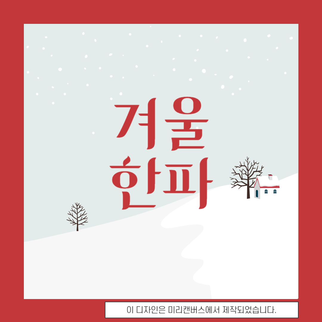 겨울철 자연재난 한파는 가족 간의 관심 및 지인들 간의 관심이 한랭질환 예방에 많은 도움이 됩니다. 한파주의보 또는 경보가 발령되었을 때 오늘 날씨가 춥다는 안부 인사 및 따뜻한 옷차림 추천으로 주변 사람까지 챙기며 따뜻한 겨울 대비하시기 바랍니다.